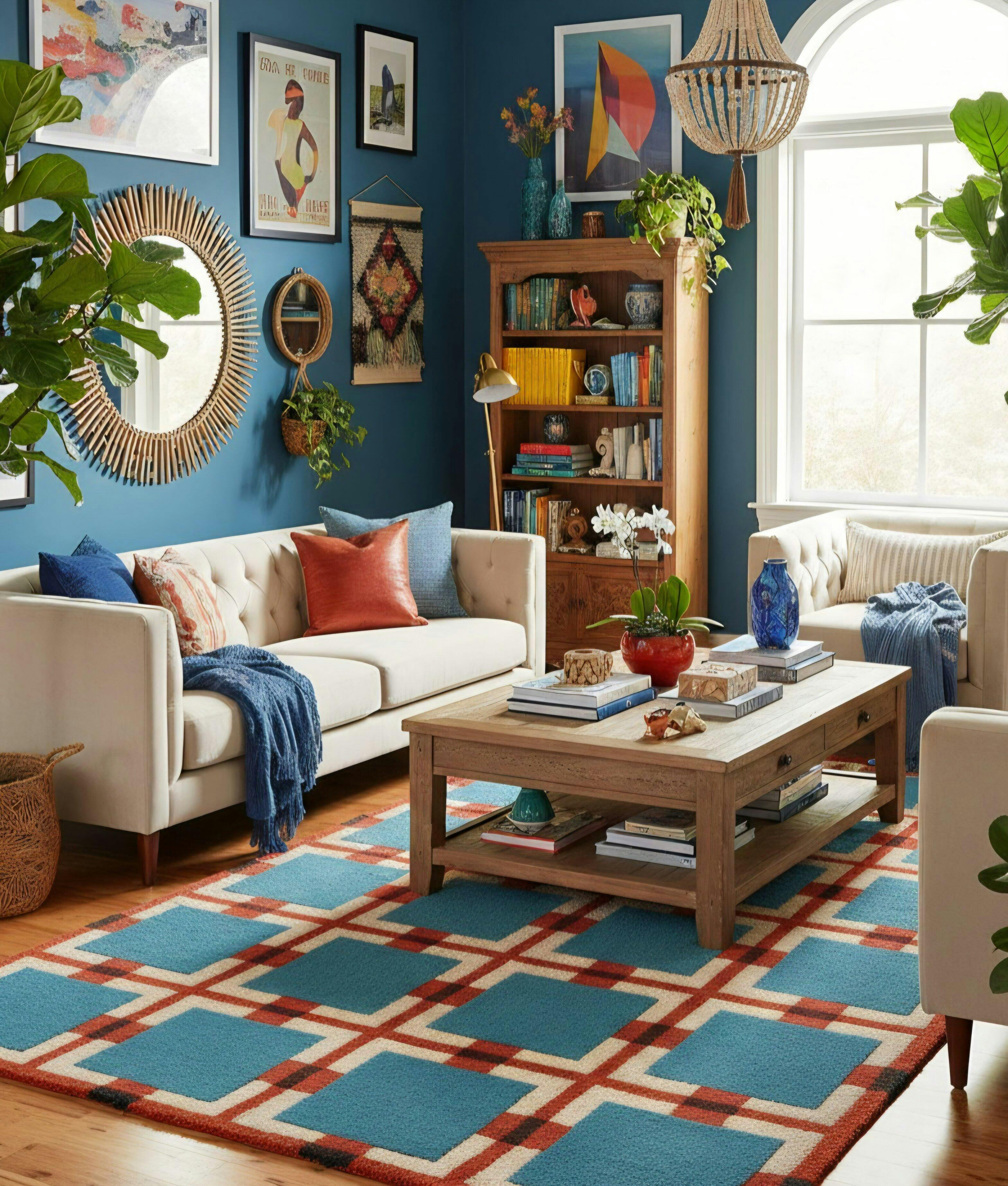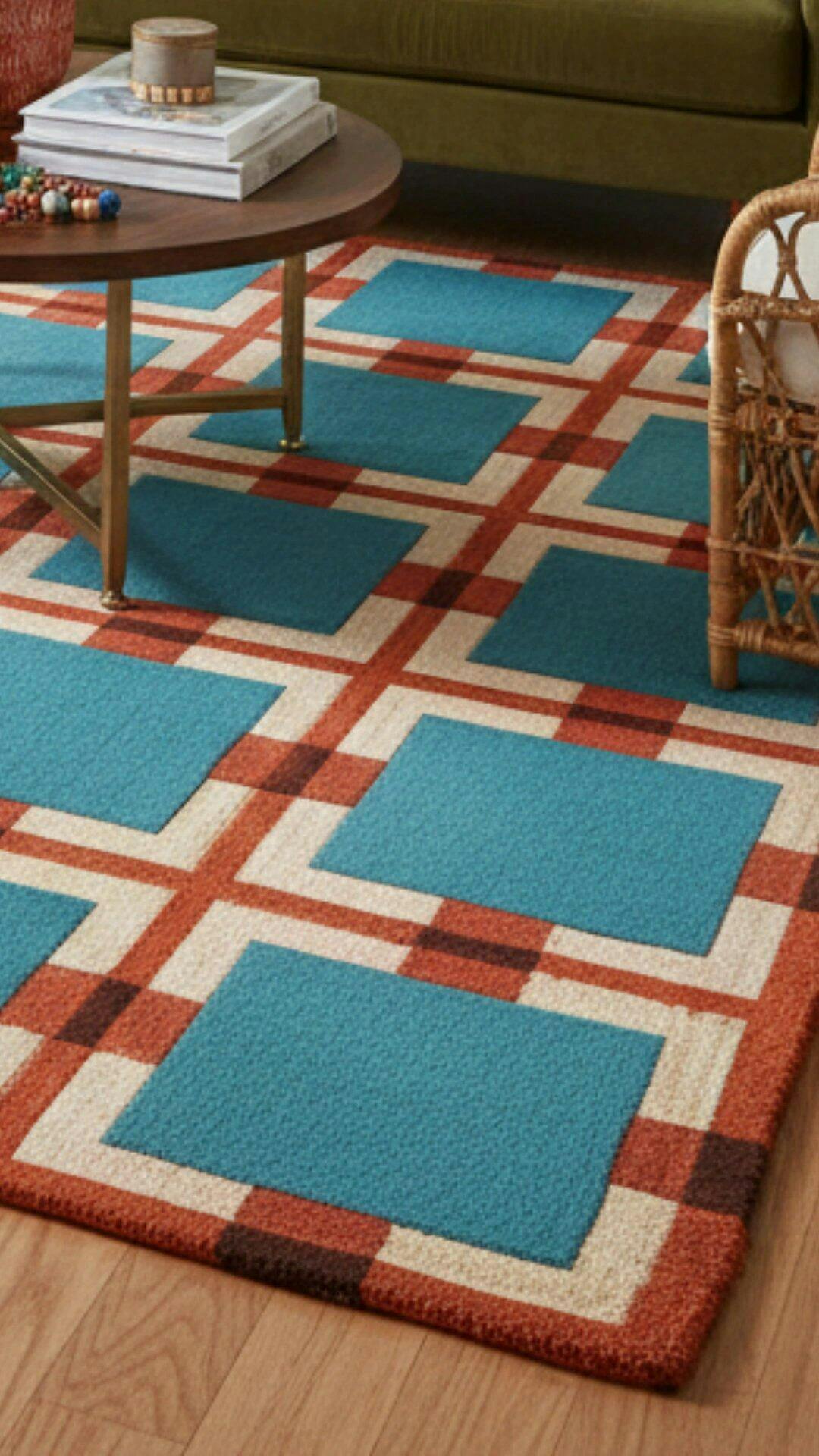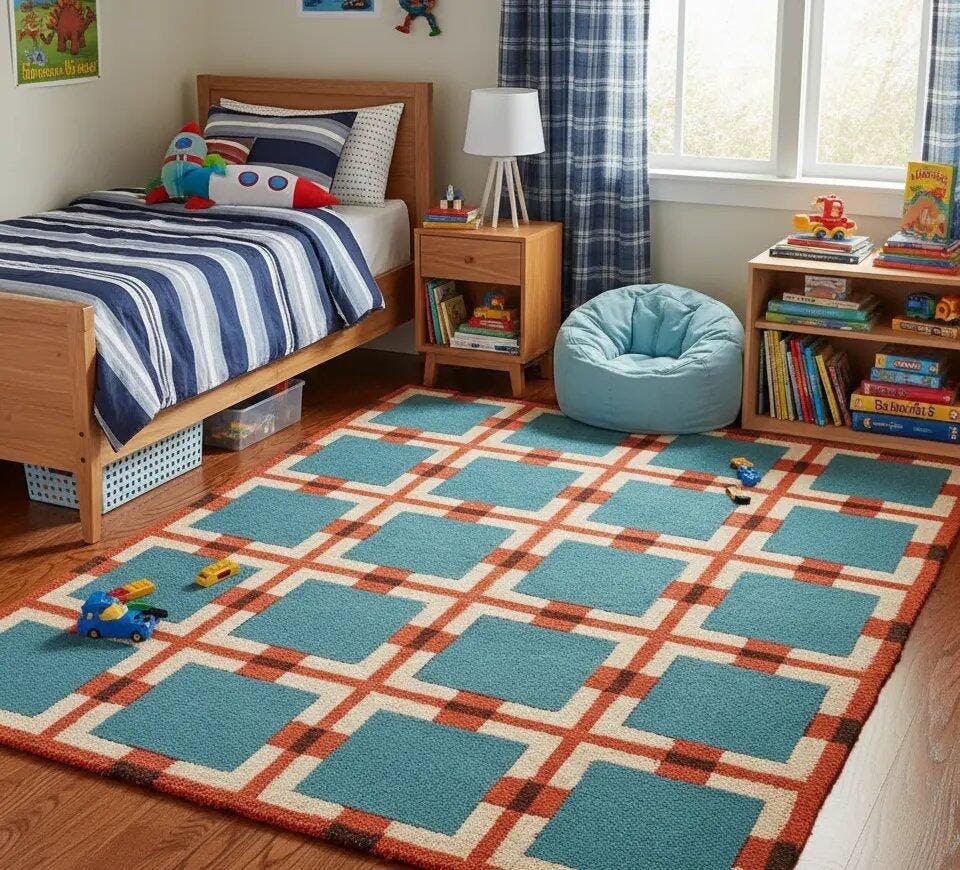 The colors are bold but very balanced. The blue and red grid gives a cool retro look without being too loud. The wool feels thick and soft, and the rug adds great warmth to the room.