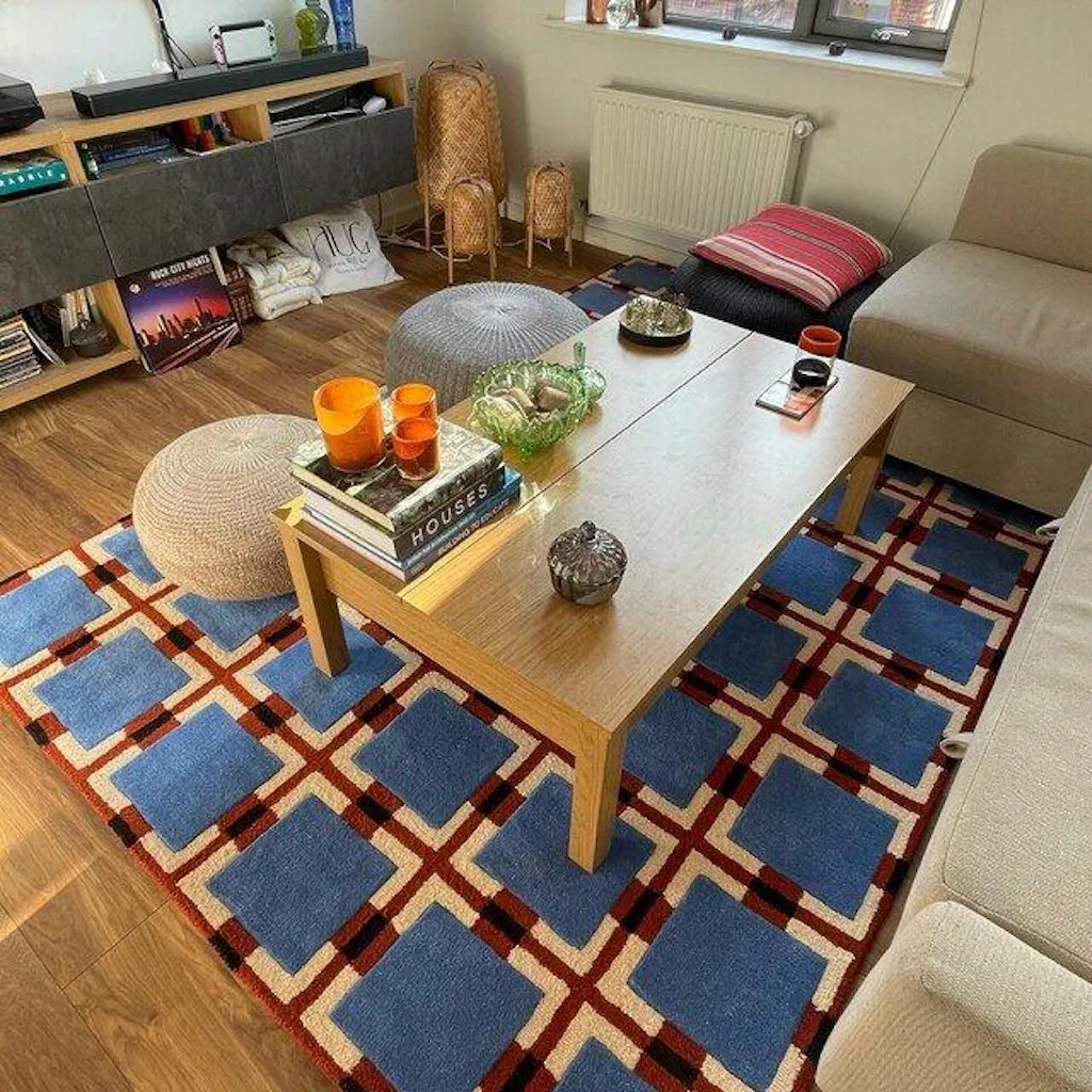 In person, the rug looks even better. I love this retro design. The blue and red colors are stunning and have made my living room look so much more beautiful. The quality is excellent, and knowing it is made to order makes it feel extra special. Truly happy with this purchase