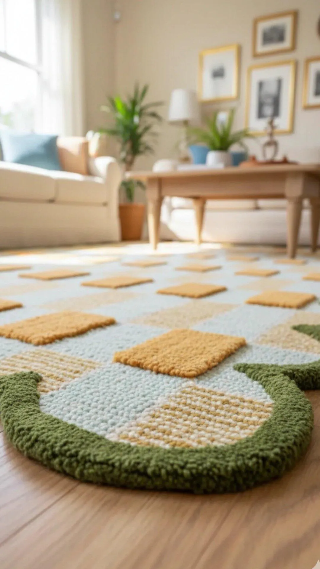 Add a cheerful twist to your space with the Classic Yellow Hand-Tufted Rug, featuring a playful checkered design and a charming scalloped green border.