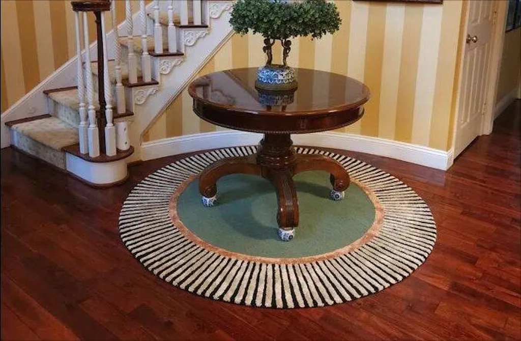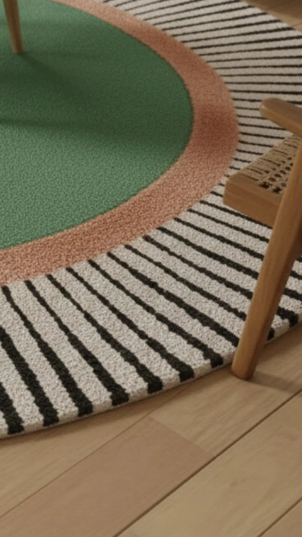 Bold, playful, and effortlessly modern, the Green and Terracotta Round Rug is a statement piece that energizes any room. Hand-tufted from premium wool, this design features a fresh green center encircled by a warm terracotta ring and finished with a striking black-and-white striped border.