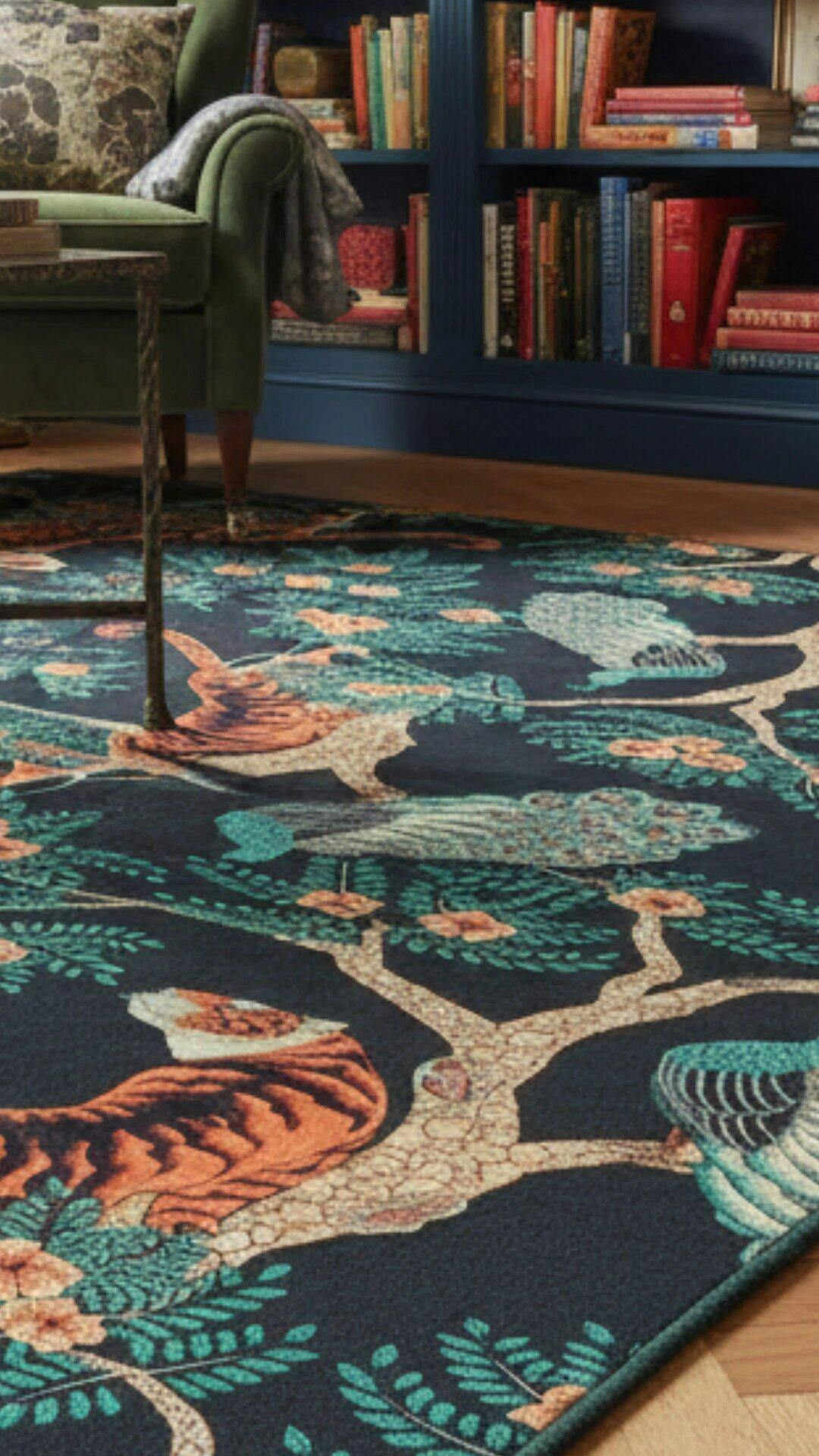 Luxury handwoven jungle-themed rug with tiger and peacock motif in a bright room with wooden floor
