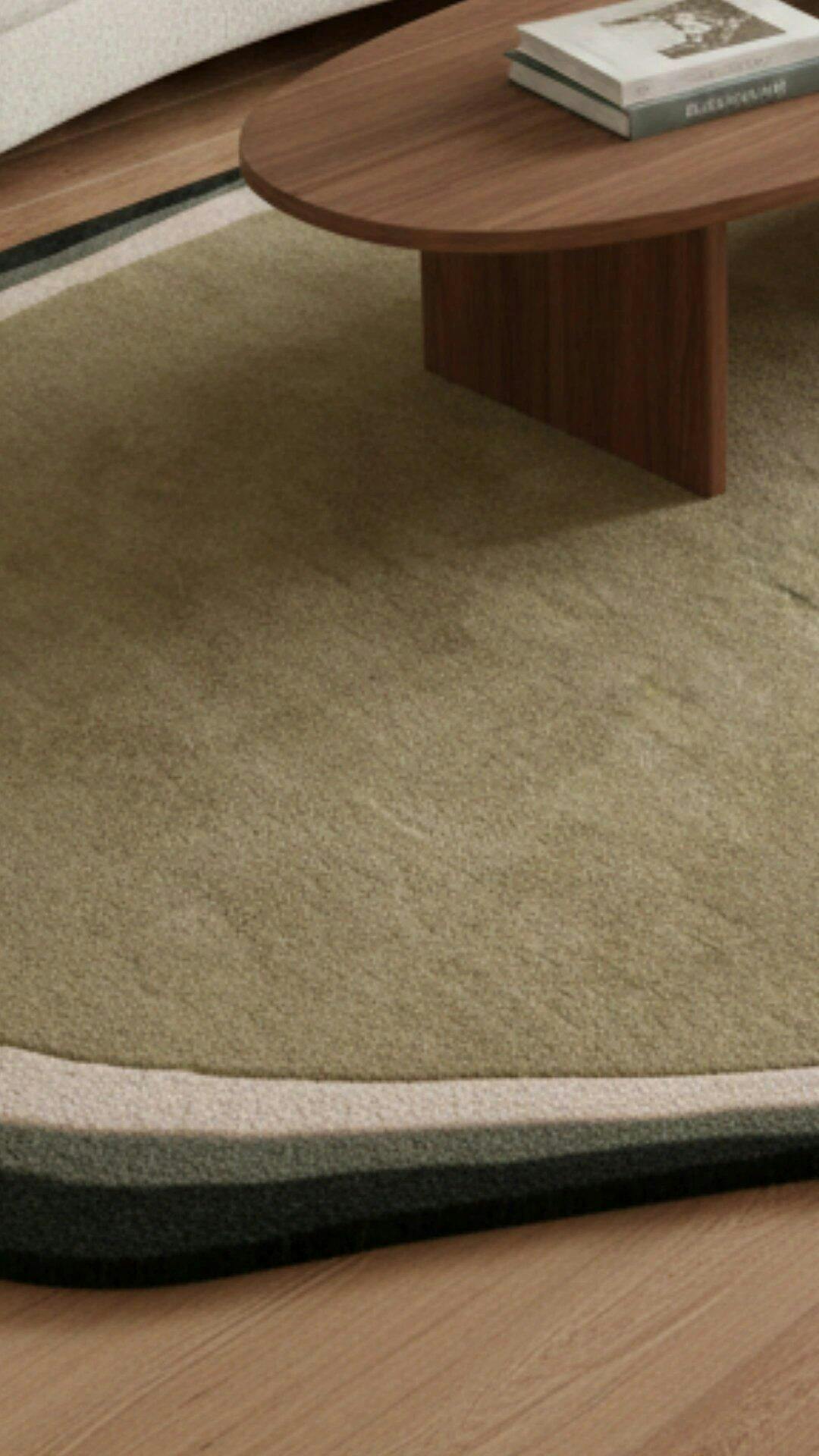 Bring natural elegance into your space with this organic free-form hand-tufted wool rug, designed in a soft olive green base framed by neutral beige and charcoal black layered borders. Its irregular shape and earthy tones create a grounding, nature-inspired look that works beautifully in modern, minimalist, or bohemian homes.