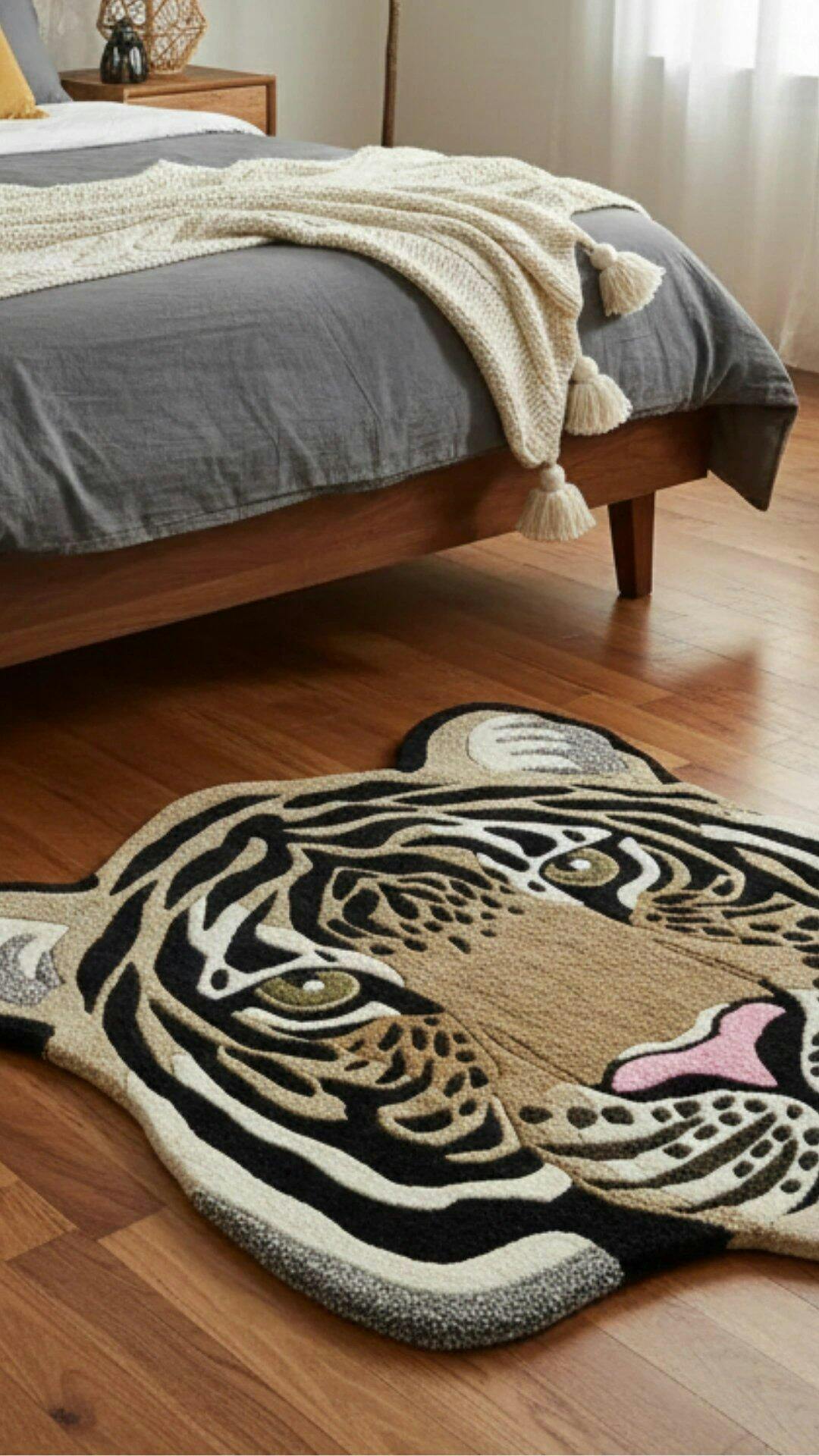Our realistic tiger face-shaped hand-tufted wool rug features lifelike detail and a unique shape, adding wild charm and bold style to any creative space.