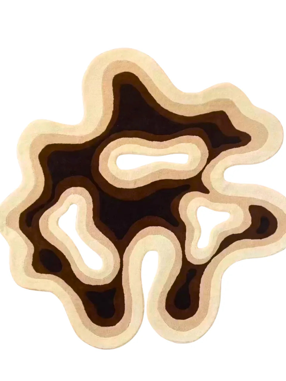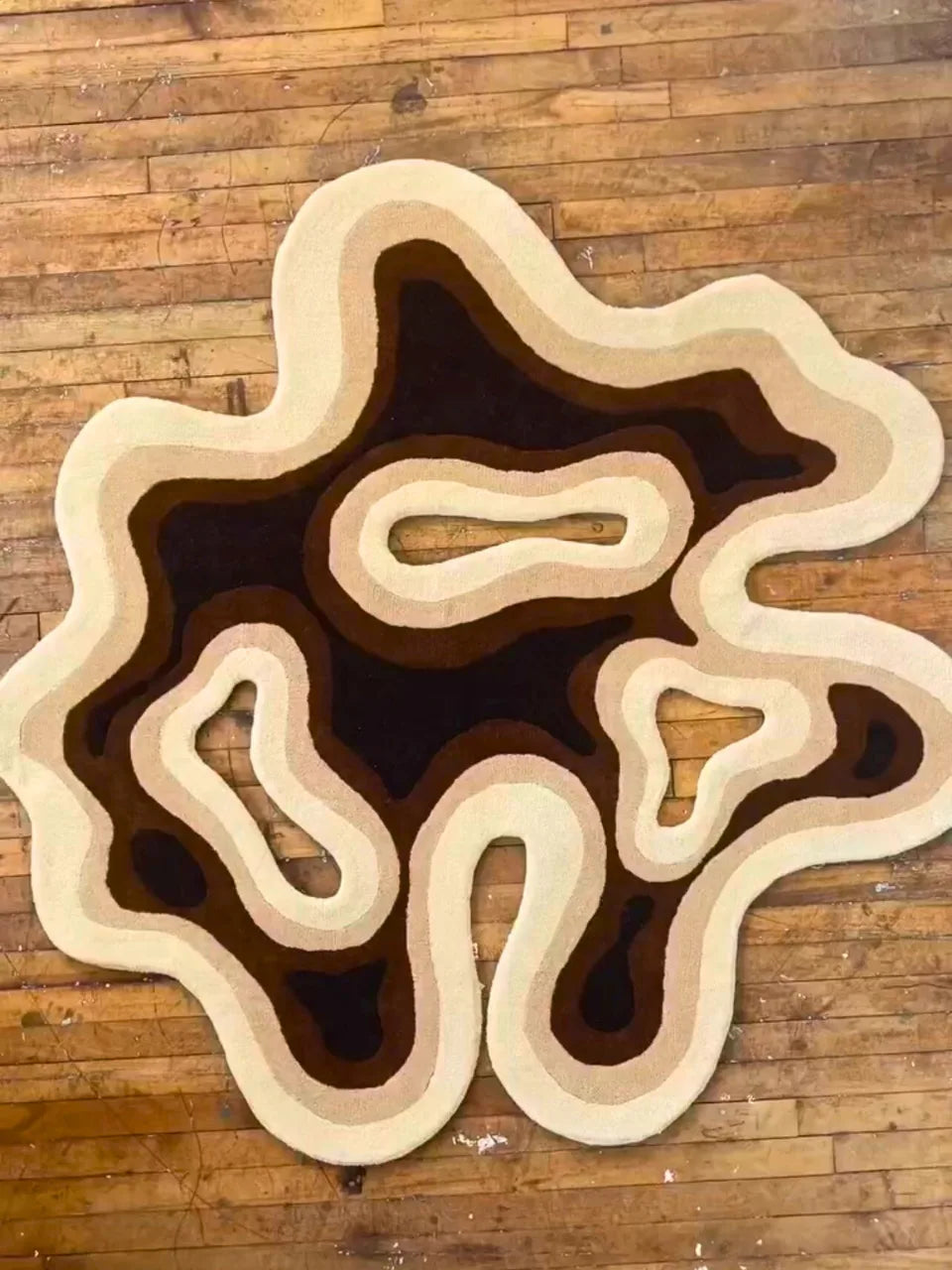 Our Modern Designer Rug- Irregular Hand-Tufted with a topographic or wavy contour pattern. It uses a soft palette of cream, light mint, and rust orange, evoking a modern, mid-century organic aesthetic. It sits well under a glass coffee table, highlighting its fluid, artful design.