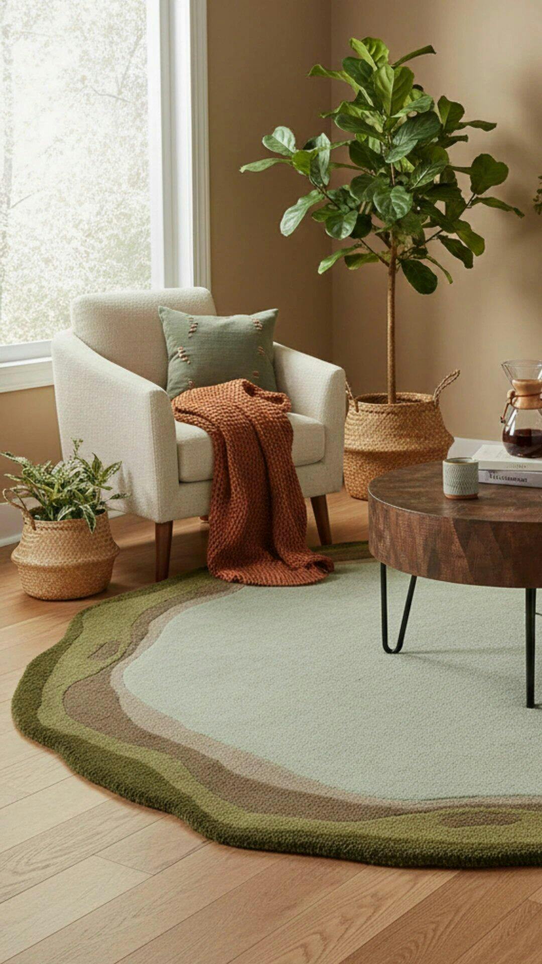 Inspired by nature’s organic beauty, the Sage Green and Earth-Tone Round Rug brings a serene, grounded aesthetic to any space. Hand-tufted with exceptional craftsmanship, this unique piece features a soft sage center surrounded by layered earth-tone borders in olive, taupe, and deep green, reminiscent of natural stone or tree rings.